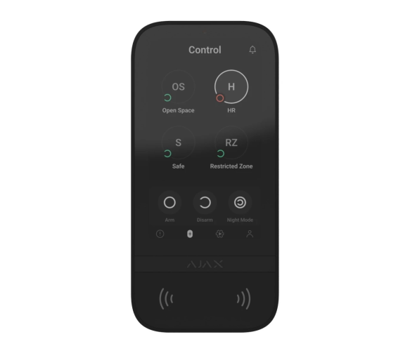 KeyPad TouchScreen обладнана вбудованим зумером, сенсорним дисплеєм та зчитувачем для безконтактної авторизації. Клавіатуру можна використовувати, щоб керувати режимами охорони та пристроями автоматизації, а також повідомляти про тривоги в системі.