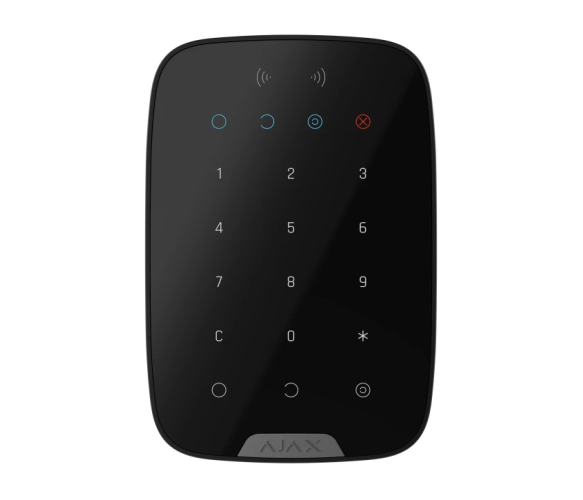 KeyPad S Plus Jeweller це бездротова сенсорна клавіатура. Дозволяє керувати системою Ajax за допомогою зашифрованих безконтактних карт та брелоків. та примусу. Світлодіодний індикатор відображає поточний режим безпеки.