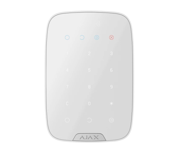 KeyPad S Plus Jeweller це бездротова сенсорна клавіатура. Дозволяє керувати системою Ajax за допомогою зашифрованих безконтактних карт та брелоків. та примусу. Світлодіодний індикатор відображає поточний режим безпеки.