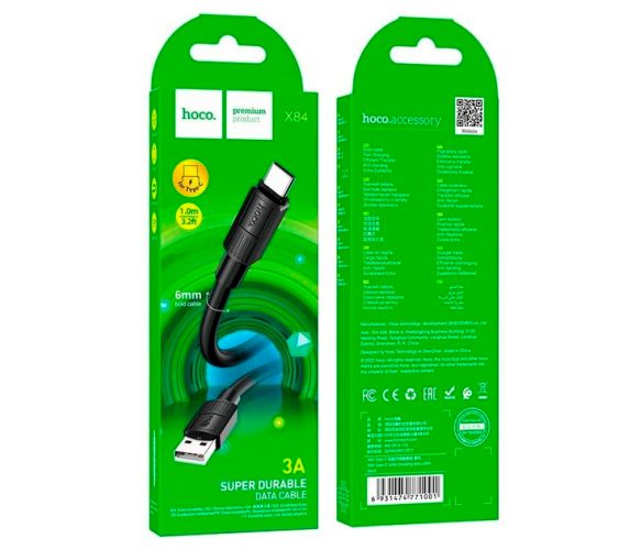 Кабель Hoco X84 - це зручний та надійний кабель з інтерфейсом Type-C-USB та високою потужністю 2.4A. Він оформлений у чорному кольорі, має довжину 1м та поставляється в коробці.