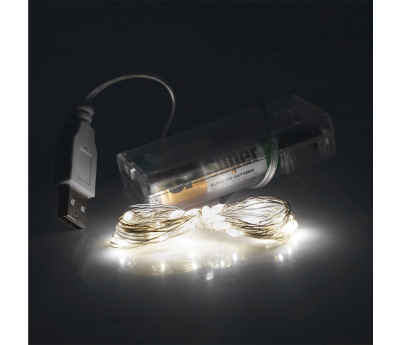 Опис: Гірлянди 30LED із прозорою ізоляцією, довжиною 3 метри, з можливістю роботи в 1 режимі. Використовується живлення від 2 батарейок типу АА (не входить у комплект). Гірлянди представлені у білому кольорі та поставляються у коробці.