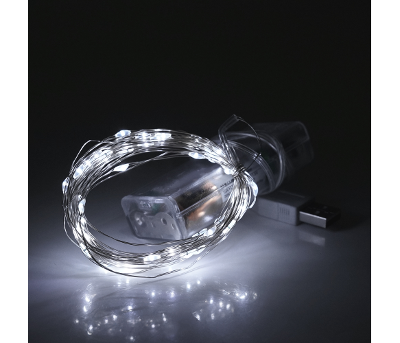 Опис: Гірлянди 50LED, 1 режим, 5 метрів, прозора ізоляція, живлення від USB + 2 * АА (немає в комплекті), White, BOX