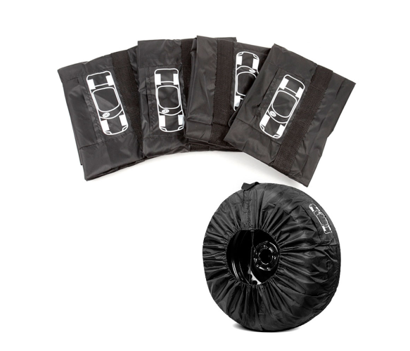 Опис : Набір чохлів для коліс, що складається з 4 штук, діаметром 80 см, придатний для шин діаметром 19-23 дюйми, чорного кольору.
