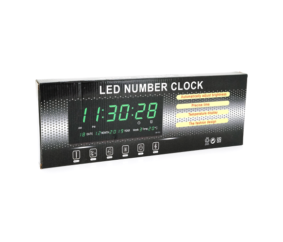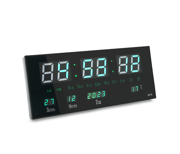Опис: Настінний годинник VST-3615 з календарем та термометром у зеленому кольорі, упакований у коробку.