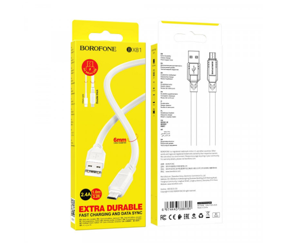 Кабель Borofone BX81 - це USB-Micro кабель довжиною 1 м, який забезпечує заряджання та передачу даних з максимальною швидкістю до 2.4A. Він поставляється у білому кольорі у зручній упаковці.