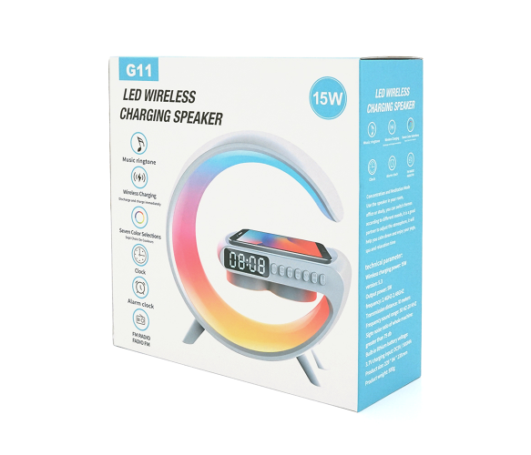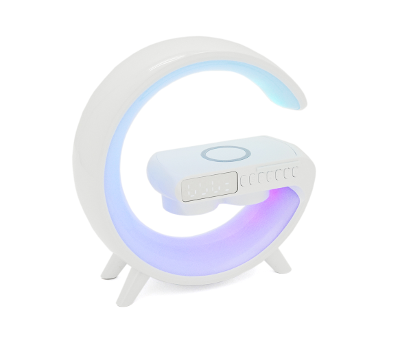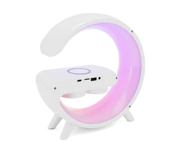 Ми пропонуємо зручний набір для вашого робочого столу або кімнати, що включає нічник з настільною лампою, Bluetooth колонку, бездротову зарядку для телефону, світло з RGB підсвічуванням та зручний контейнер для зберігання.