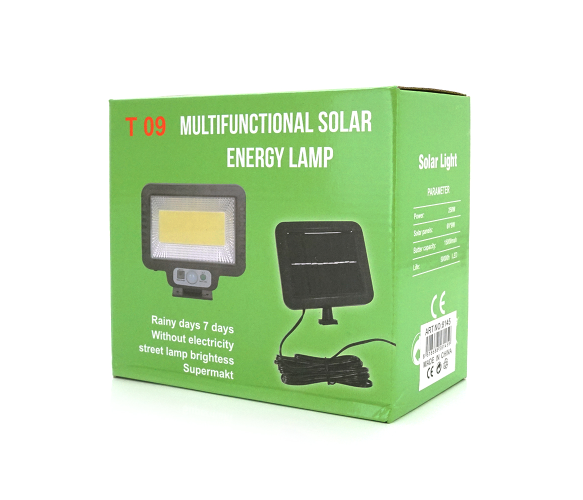 Опис: Вуличний ліхтар T 09 із сонячною панеллю+пульт, вбудований акумулятор, кріплення на стіну, колір чорний.