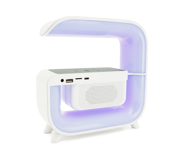 Опис: Цей масив являє собою різні предмети, які пов'язані з технікою та електронікою, такі як настільна лампа-нічник, Bluetooth колонка, бездротова зарядка телефону, світло RGB та коробка.