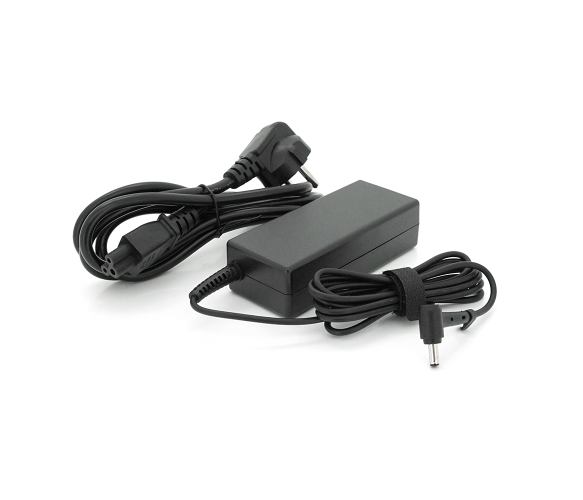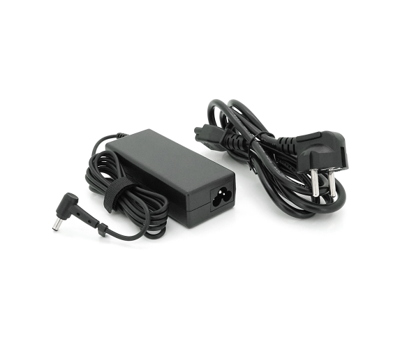Блок живлення підключається до ноутбука через штекер 4.5×3.0 мм і до електромережі через кабель, що додається. Він автоматично регулює напругу, забезпечуючи безпечну зарядку акуму