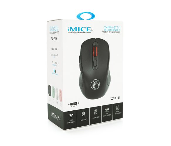 Бездротова миша iMICE W-718 призначена для зручної роботи з комп'ютером. Пристрій має шість кнопок і підтримує три різні рівні DPI (800/1200/1600), що дозволяє користувачеві вибирати оптимальну чутливість для роботи. Миша працює за стандартом 2.4Ghz та Bluetooth, забезпечуючи стабільне підключення на відстані до 10 метрів. Сумісність з операційними системами Windows XP/Vista/Win7/8/10 та Mac OS X робить цю мишу універсальним пристроєм. Крім того, пристрій має акумулятор, який можна перезаряджати, і має білий колір.
