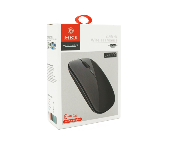 Бездротова миша iMICE E-1300 із можливістю перемикання чутливості від 800 до 1600 DPI. Має 4 кнопки та працює на частоті 2,4 ГГц з радіусом дії до 10 метрів. Сумісна з операційними системами Windows XP/Vista/Win7/8/10 і Mac OS X. Миша має можливість заряджання і поставляється в білому кольорі в коробці.