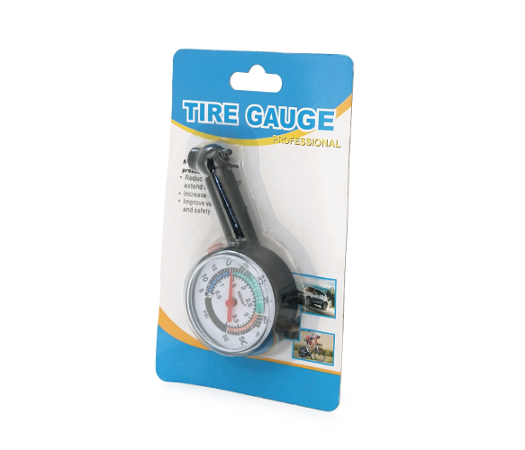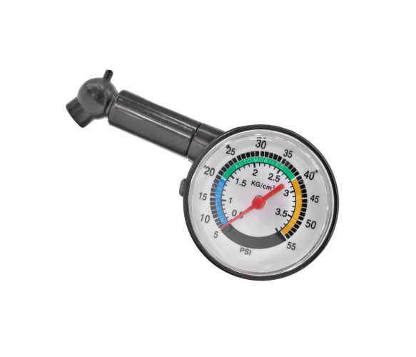 Механічний манометр для шин виготовлений із пластику та здатний вимірювати тиск до 5 атмосфер.