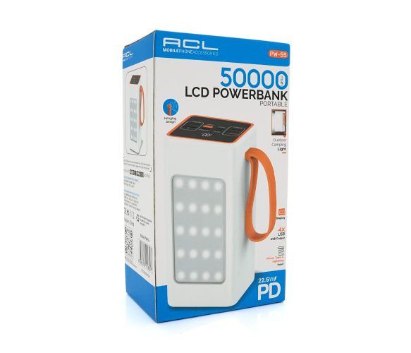 Цей портативний акумулятор Powerbank ACL PW-55 має ємність 50000mAh та підтримує технологію швидкої зарядки PD 22.5W. Він виконаний у білому кольорі та поставляється у зручній упаковці.