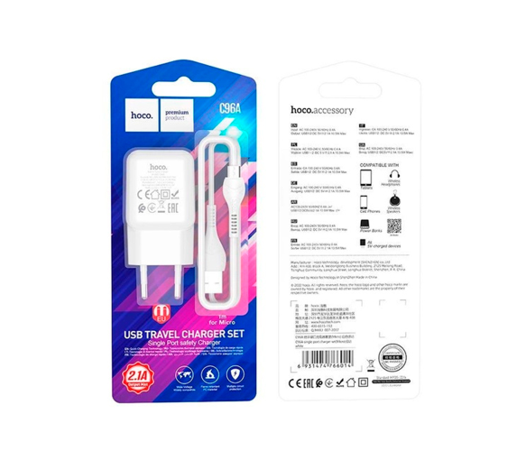 Цей набір включає мережний зарядний пристрій з одним портом USB і кабель Micro USB. СЗУ має вихідний струм до 2.1A, що забезпечує швидке заряджання пристроїв. Кабель Micro USB довжиною 1 метр також підтримує струм до 2.1A і призначений для заряджання та синхронізації сумісних пристроїв із роз'ємом Micro USB. Упаковка в блістері забезпечує зручність при транспортуванні та зберіганні.