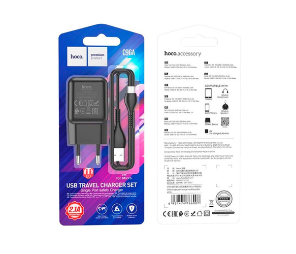 Цей набір включає мережний зарядний пристрій з одним портом USB і кабель Micro USB. СЗП забезпечує вихідний струм до 2.1A, що забезпечує швидку зарядку пристроїв. Кабель Micro USB довжиною 1 метр також підтримує струм до 2.1A і призначений для заряджання та синхронізації сумісних пристроїв із роз'ємом Micro USB. Упаковка в блістері забезпечує зручність при транспортуванні та зберіганні.