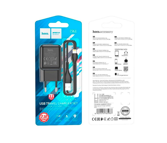 Цей набір включає мережний зарядний пристрій з одним портом USB і кабель Lightning. СЗП підтримує вихідний струм до 2.1A, що забезпечує швидке заряджання пристроїв. Кабель Lightning довжиною 1 метр також підтримує струм до 2.1A і призначений для заряджання та синхронізації сумісних пристроїв із роз'ємом Lightning. Упаковка в блістері забезпечує зручність при транспортуванні та зберіганні.