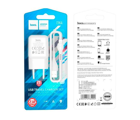 Цей набір включає мережний зарядний пристрій з одним портом USB і кабель Lightning. СЗП забезпечує вихідний струм до 2.1A, що дозволяє швидко заряджати пристрої. Кабель Lightning довжиною 1 метр також підтримує струм до 2.1A і призначений для заряджання та синхронізації сумісних пристроїв із роз'ємом Lightning. Упаковка в блістері забезпечує зручність при транспортуванні та зберіганні.