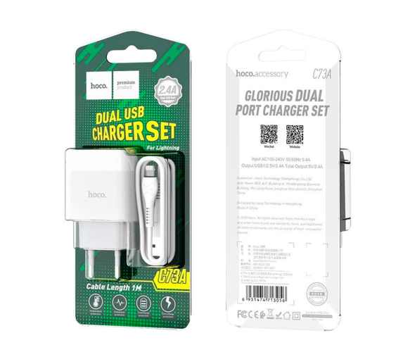 Цей набір включає мережний зарядний пристрій з двома портами USB і кабель Lightning. СЗУ забезпечує вихідний струм до 2.4A кожному порту для швидкої зарядки пристроїв. Кабель Lightning довжиною 1 метр також підтримує струм до 2.4A і призначений для заряджання та синхронізації сумісних пристроїв із роз'ємом Lightning. Упаковка в блістері забезпечує зручність при транспортуванні та зберіганні.