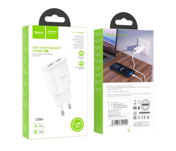 Цей зарядний пристрій має два порти USB, які дозволяють одночасно заряджати два пристрої. Кожен порт може забезпечувати вихідний струм до 2.4A для швидкого заряджання пристроїв. Упаковка в коробці забезпечує зручність при транспортуванні та зберіганні.