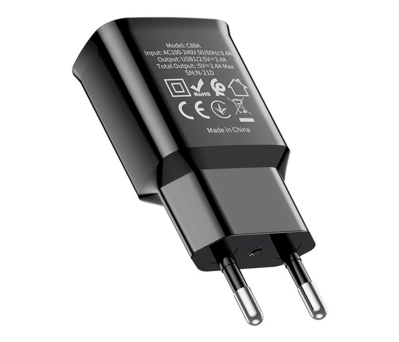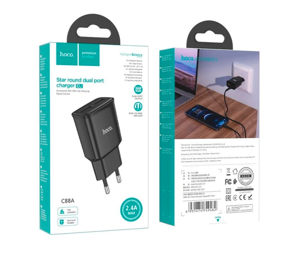 Цей зарядний пристрій оснащений двома портами USB, що дозволяють одночасно заряджати два пристрої. Кожен порт здатний забезпечувати вихідний струм до 2.4A, забезпечуючи швидке заряджання пристроїв. Упаковка в коробці забезпечує надійний захист при транспортуванні та зберіганні.