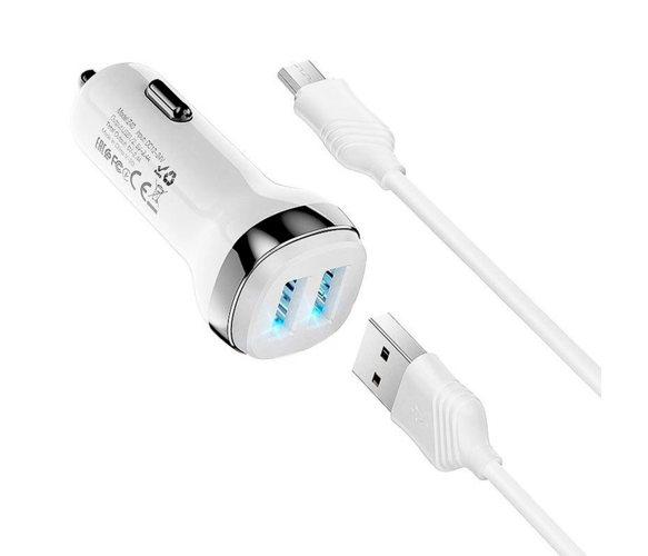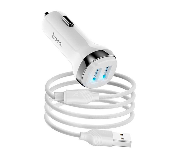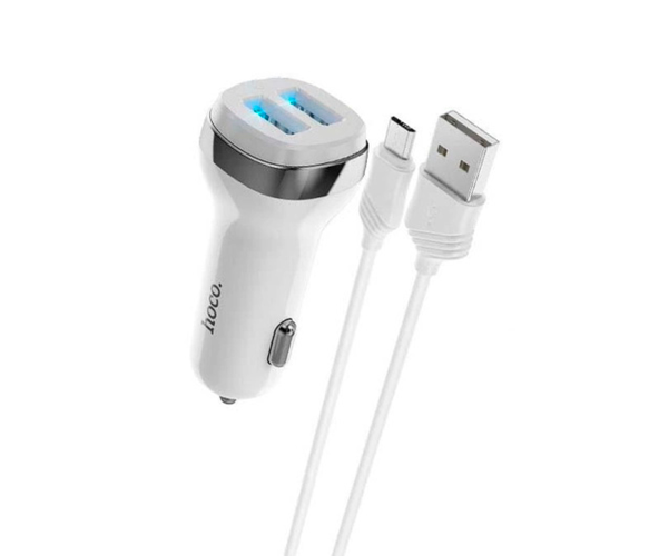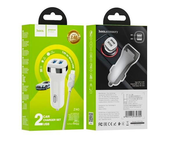 Набір зарядних пристроїв для автомобіля HOCO Z40+ з кабелем Micro, 2 роз'єми USB та виходом 2.4A. Довжина кабелю 1м. Колір білий. Упаковка – коробка.