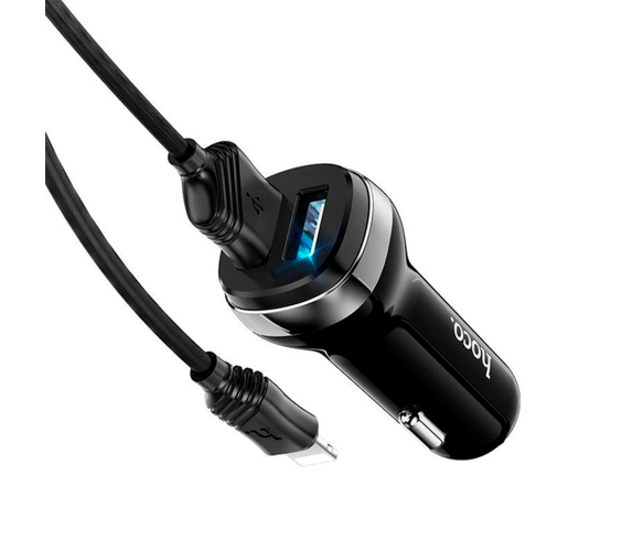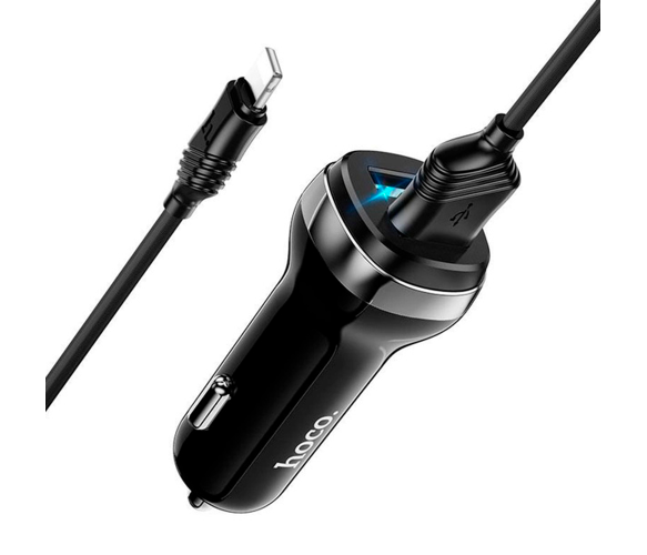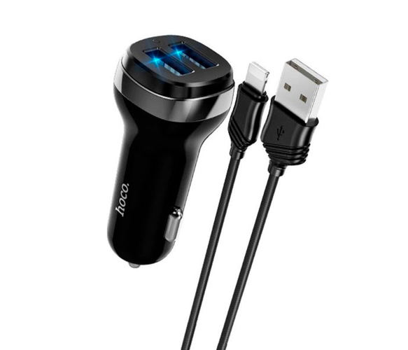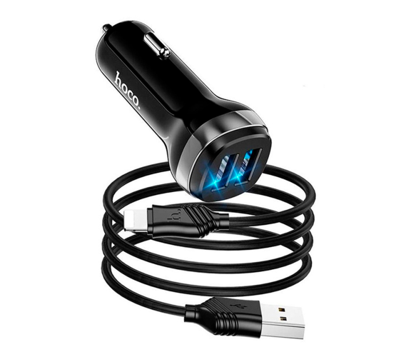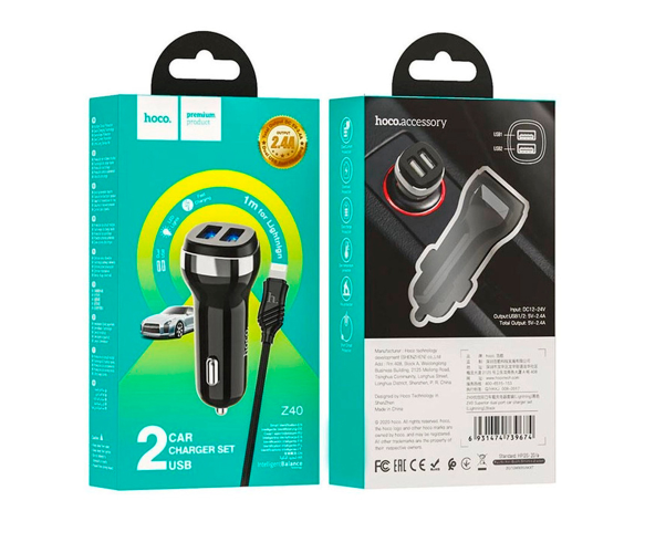 Набір зарядних пристроїв для автомобіля 12-24V HOCO Z40+ з кабелем Lighting, 2xUSB, 2.4A, довжиною 1м, чорний, поставляється в коробці.