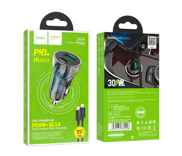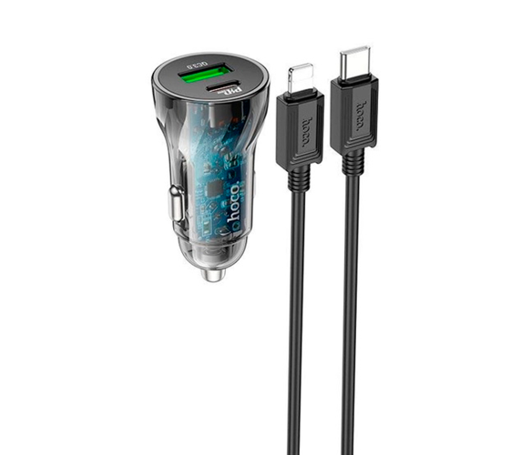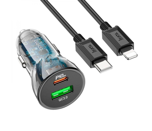 Універсальний автомобільний зарядний набір для одночасного підключення кількох пристроїв. Комплект включає компактний зарядний пристрій із двома USB-портами та кабель Lightning для зручної підзарядки гаджетів у дорозі.