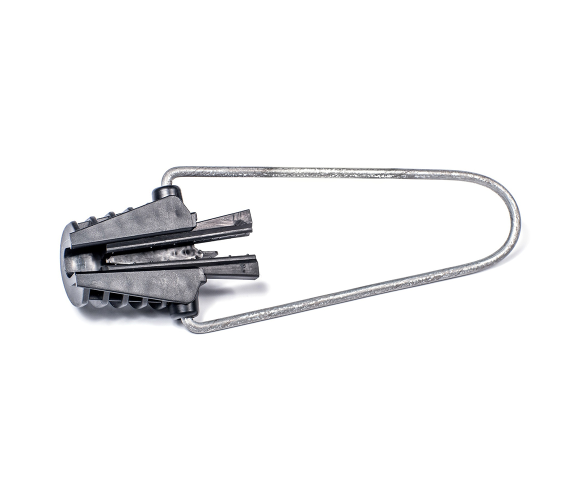 Анкерний натяжний затискач призначений для швидкого закріплення самонесучих ADSS оптичних кабелів круглого перерізу до 6 мм, кабелів на сталевому дроті або тросі. Забезпечують затискання і закріплення кабелів, без необхідності оголювати або відокремлювати трос, що несе. Конструктивно простий затискач для побудови повітряних ліній зв'язку по стовпах освітлення з максимальним прольотом 50 м. Кріпиться за петлю до траверсів Т401, КТ-251, гаків, кронштейнів. Петля виготовлена із високоякісного сталевого дроту гарячого цинкування. Затискачі складається з литого пластикового корпусу, з високоміцного, морозостійкого пластику і полімерних клинів, що самоналаштовуються, які затискають несучий елемент без пошкодження ізоляції. Чи не вимагають інструменту для монтажу.