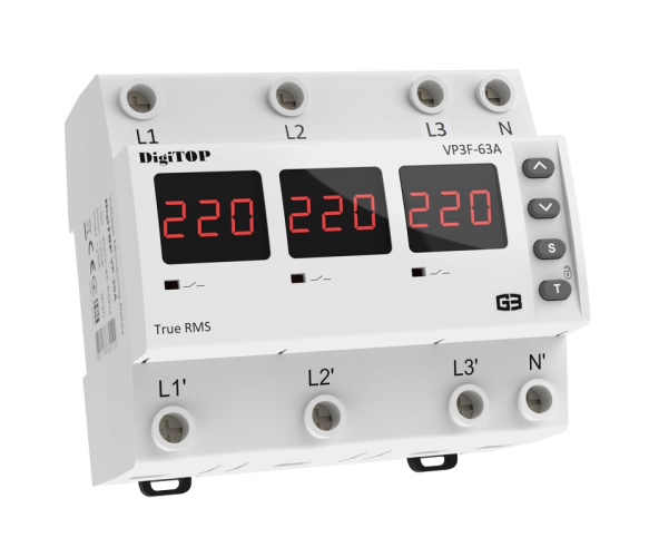 Опис: Реле напруги VP-3F63А M6R є дворежимним одно/трифазним пристроєм, встановленим на DIN-рейку. Воно має шість модулів та оснащено індикатором напруги (червоний). Реле призначене для роботи в діапазоні напруги 120-270В і забезпечує захист електроустаткування від перенапруг.