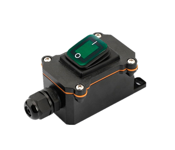 Перемикач зовнішнього монтажу є зеленою кнопкою з підсвічуванням, захищеною за стандартом IP65. Пристрій розрахований на роботу при напрузі 12-24V та має чорний колір.