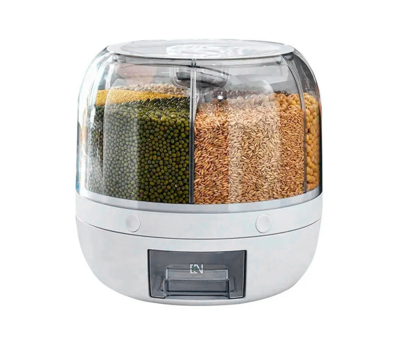 Вологостійкий контейнер YT-474, що обертається, призначений для зберігання круп і спецій. Контейнер обладнаний 6 відділеннями, що забезпечує зручність при розподілі продуктів та їх зберіганні.
