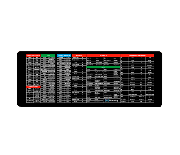 Тканинний килимок чорного кольору з бічною прошивкою і товщиною 2 мм, призначений для використання разом з English Shortcut keys-1. Розміри килимка становлять 300*700 мм. Комбінація англійським мовою