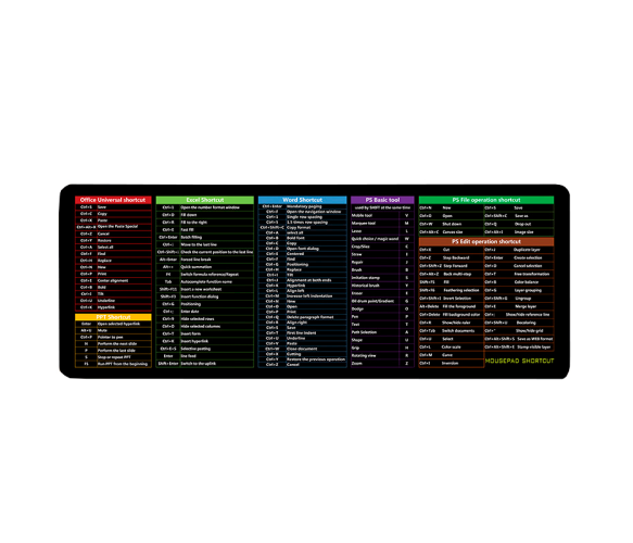 Тканинний килимок чорного кольору з бічною прошивкою і товщиною 2 мм, призначений для використання разом з Shortcut keys-3. Розміри килимка становлять 300*700 мм. Комбінація English мовою