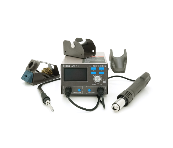 Паяльна станція термоповітряна BAKU BA-602C+ призначена для професійного використання. Вона оснащена феном та паяльником, має цифрову індикацію та працює від змінного струму з напругою 220 В.