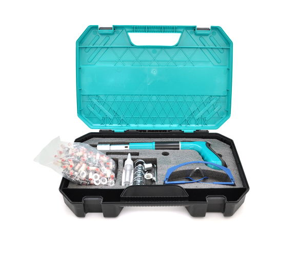 Пістолет будівельно-монтажний YT-198406 призначений для використання із цвяхами та металевими заклепками. У комплекті є захисні окуляри та 100 цвяхів монтажних піроксилінових. Валіза зеленого кольору також включено в комплект.