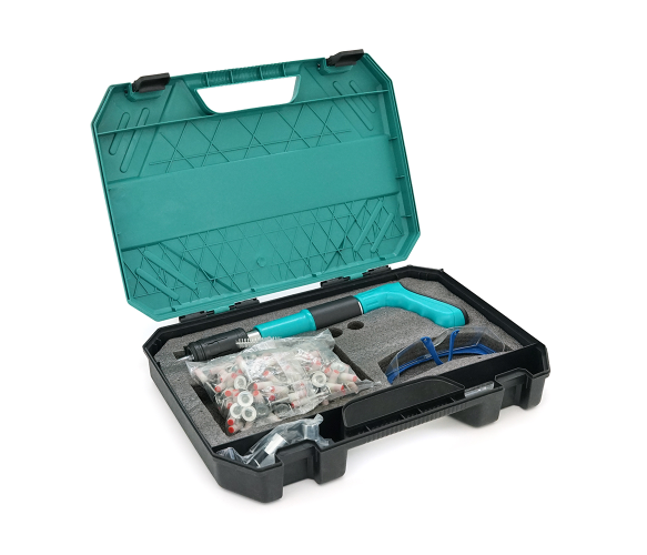 Опис: Пістолет будівельно-монтажний YT-35791 + 100 цвяхів монтажних піроксилінових, захисні окуляри, валіза, Green