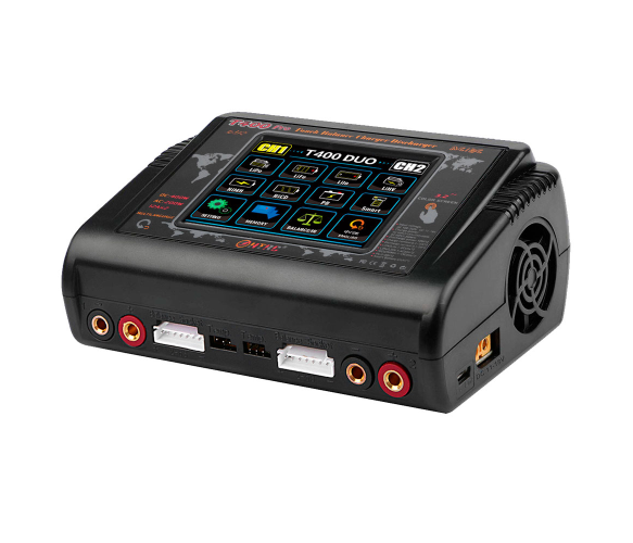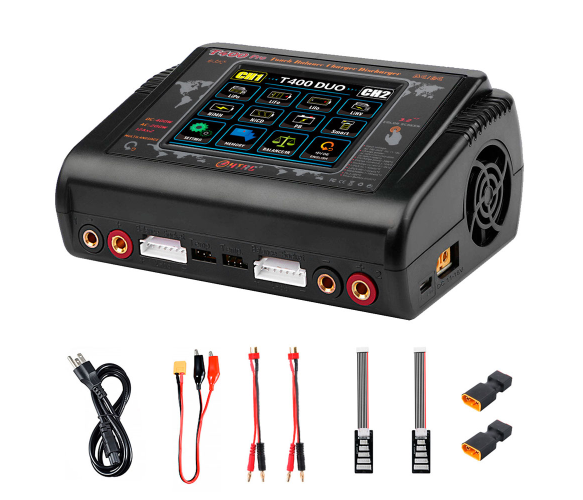 Зарядний пристрій HTRCT400ProDuo AC200/DC400Вт призначений для заряджання різних типів акумуляторів, має 3.2-дюймовий сенсорний екран і компактні габарити 100*65*140 мм.