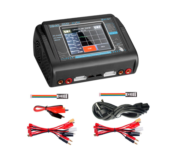 Зарядний пристрій HTRC T240 Duo призначений для заряджання акумуляторів різних типів, а також має сенсорний екран розміром 3.2 дюйма. Габарити пристрою становлять 145x105x64мм.