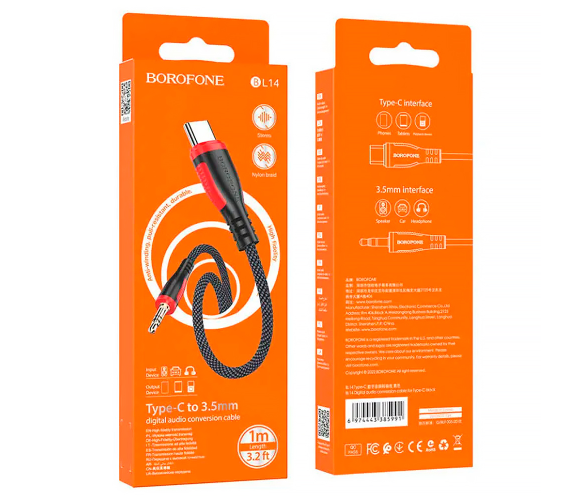 Опис: Перехідник Borofone BL14 призначений для підключення пристроїв із роз'ємом Jack 3.5mm до пристроїв із роз'ємом Type-C. Він має довжину 1 метр, чорного кольору та поставляється у зручній упаковці.