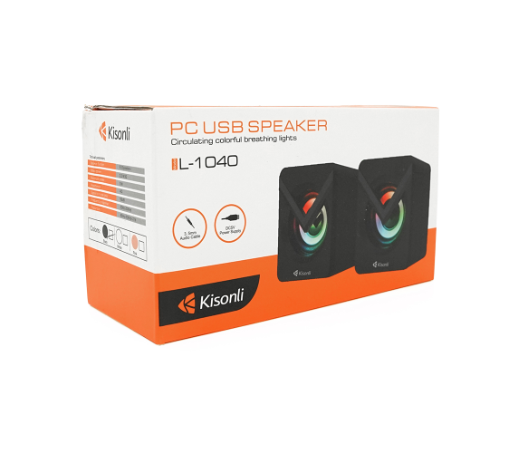 Колонки 2.0 Kisonli L-1040 призначені для використання з ПК та ноутбуками. Вони обладнані USB та 3.5mm роз'ємами, мають потужність 2x3W, частотний діапазон 20Гц-20кГц, їх розміри становлять 20х11х13 мм, колір – чорний.