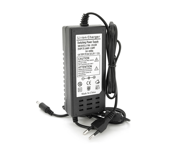 Зарядний пристрій призначений для заряджання літій-іонних акумуляторів (Li-ion) з номінальною напругою 25,2 і кількістю банок 6S (послідовно з'єднаних). Зарядний струм становить 2 А. Пристрій оснащений штекером 5,5-2,1 мм для підключення до акумулятора, що заряджається. Індикація процесу заряджання дозволяє контролювати його стан.