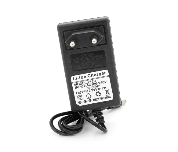 Зарядний пристрій призначений для заряджання літій-іонних акумуляторів з напругою 21 В, що складаються з 5 послідовно з'єднаних елементів (5S). Має вихідний струм 2 А та оснащено штекером 5,5 х 2,5 мм.