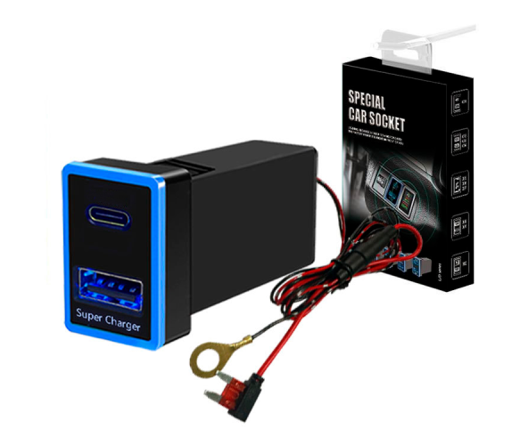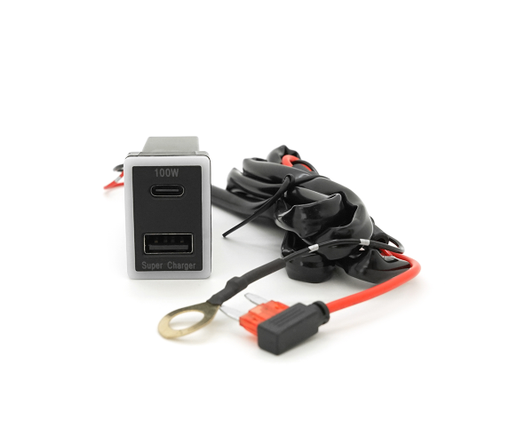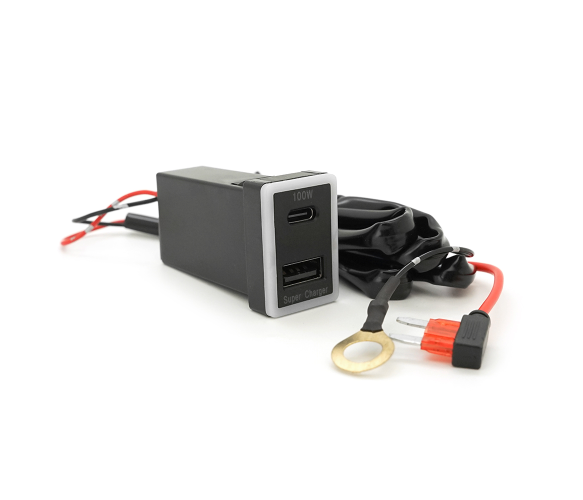 АЗУ врізне 130W-D01T03-Fuse, PD+QC, Type-C: 100W, USB: 30W, LED підсвічування, комплект проводів з роз'ємами та запобіжником, 33x22х58mm, Black