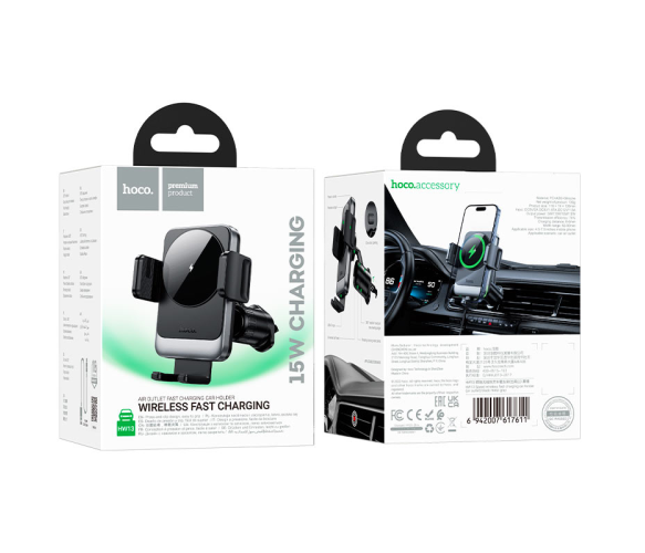 Автоутримувач HOCO HW13+ Wireless Charging 15W, кріплення на решітку, затискач 50-90мм, Black, Box