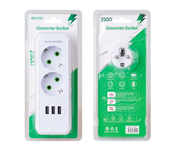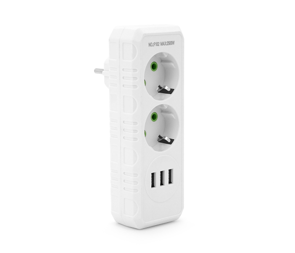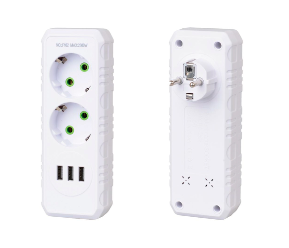 Розетка-трійник F102-White - це практичний та універсальний пристрій, який дозволяє підключати кілька приладів одночасно. Завдяки двом стандартним розеткам із заземленням та трьом USB-портам, ця модель стане ідеальним рішенням для дому чи офісу, де потрібне підключення різних пристроїв, таких як телефони, планшети, ноутбуки, побутова техніка та інше.