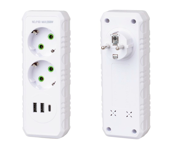 Розетка-трійник F103 - це практичний та універсальний пристрій, який дозволяє підключати кілька приладів одночасно. Завдяки двом стандартним розеткам із заземленням та трьом USB-портам, ця модель стане ідеальним рішенням для дому чи офісу, де потрібне підключення різних пристроїв, таких як телефони, планшети, ноутбуки, побутова техніка та інше.