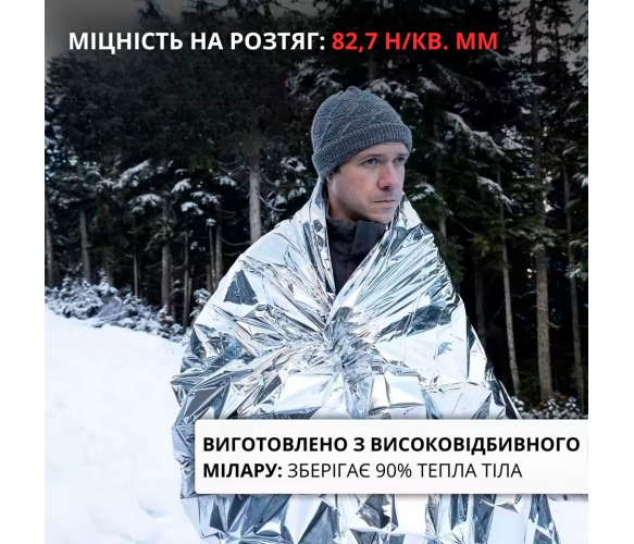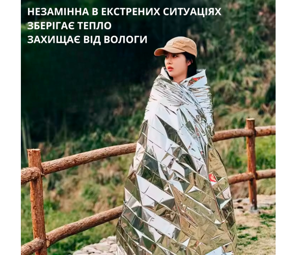 Це одноразове рятувальне покривало є незамінним засобом в екстремальних ситуаціях, де важливо швидко забезпечити себе або інших комфортними умовами.