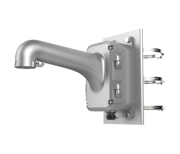 DS-1604ZJ-BOX – надійне та функціональне кріплення, що дозволяє встановити відеокамеру формату PTZ на стовпі. Має вертикальне кріплення та вбудовану розподільну коробку для проведення. Монтується на стовпах за допомогою сталевих хомутиків. Ширина охоплення має бути в межах 100-200мм. Кронштейн виконаний із алюмінію. Складається з майданчика, комутаційного боксу, що відкривається, і ручки для камери. Має стандартне кріплення для панорамних пристроїв. Також є страхувальний гачок для більшої безпеки техніки. Розрахована вага обладнання, що встановлюється - до 10кг. 1604ZJ-BOX-POLE-P, за рахунок великої розпредкоробки, передбачає естетичне та захищене розміщення всередині адаптера живлення. Провід виводяться по передбаченій трубці в ручці.