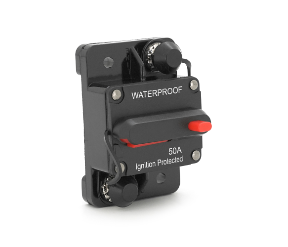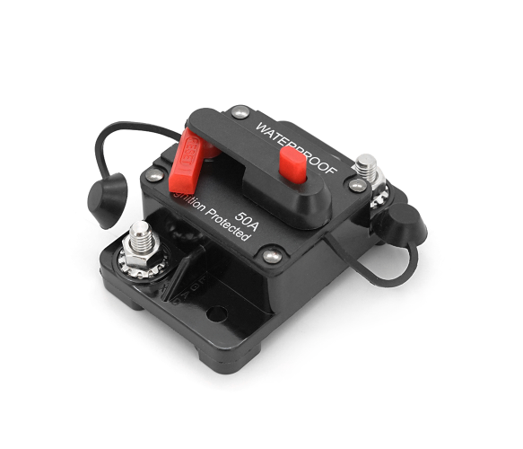Автоматичний вимикач запобіжник однополюсний постійного струму 12-48V, модель GG-CB5 Waterproof 50A, є надійним електричним пристроєм, розробленим для захисту електричних схем від перевантажень і коротких замикань у системах постійного струму. Цей високоякісний запобіжник має вологозахист, що дає змогу використовувати його в умовах підвищеної вологості або під час роботи поза приміщеннями.