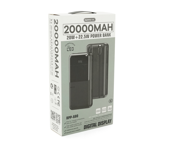 Power Bank Remax RPP-680 20000mAh, USB+Type-C+Lighting, 22.5W, Black, 0.47kg